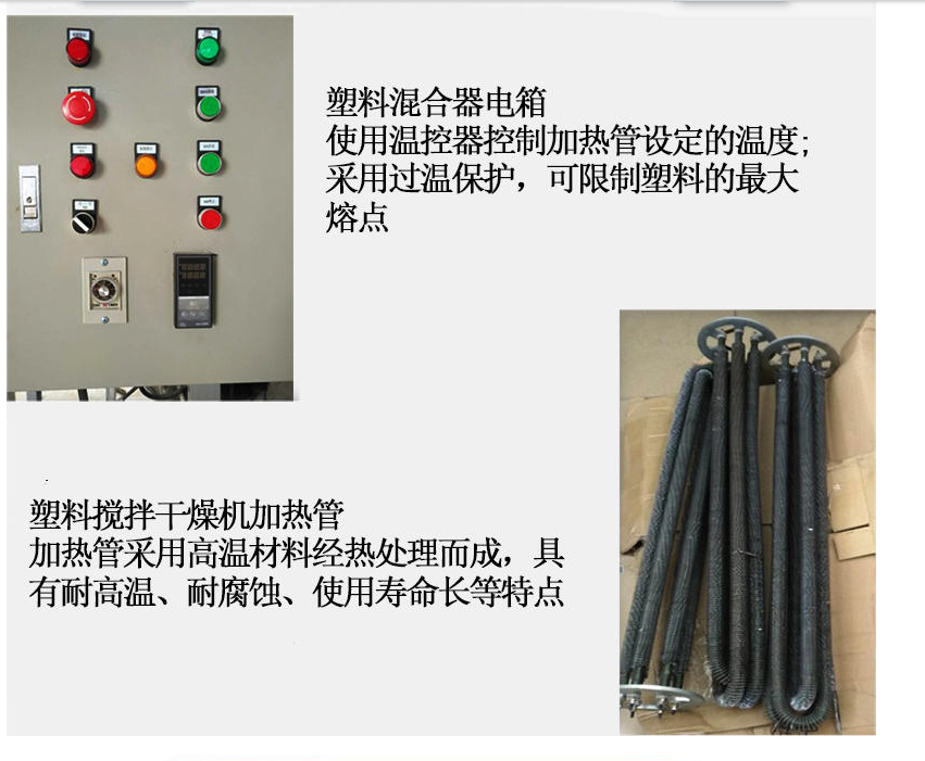 8、干燥混合功能二合一,當(dāng)不需要干燥時,只需將"加熱開關(guān)"及"風(fēng)機(jī)開關(guān)"關(guān)閉,本系列機(jī)型即可用于塑料攪拌均化用途,一機(jī)二用.
